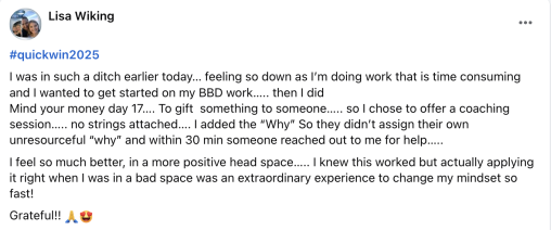 I've invited ALL of my clients to join along in this challenge, so you'll have HUNDREDS of entreprenuers going through this process with you all at the same time. We'll be connecting and coaching in a dedicated Facebook Group every daily.