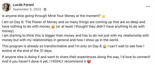 But if any part of you has already sensed that your relationship with money feels off... maybe you've already noticed a persistent pattern... or a limiting belief... and you're willing to be 100% COACHABLE and COMMITTED for the next 30 Days to show up for yourself and your dreams, then The Mind your Money Challenge is for you!